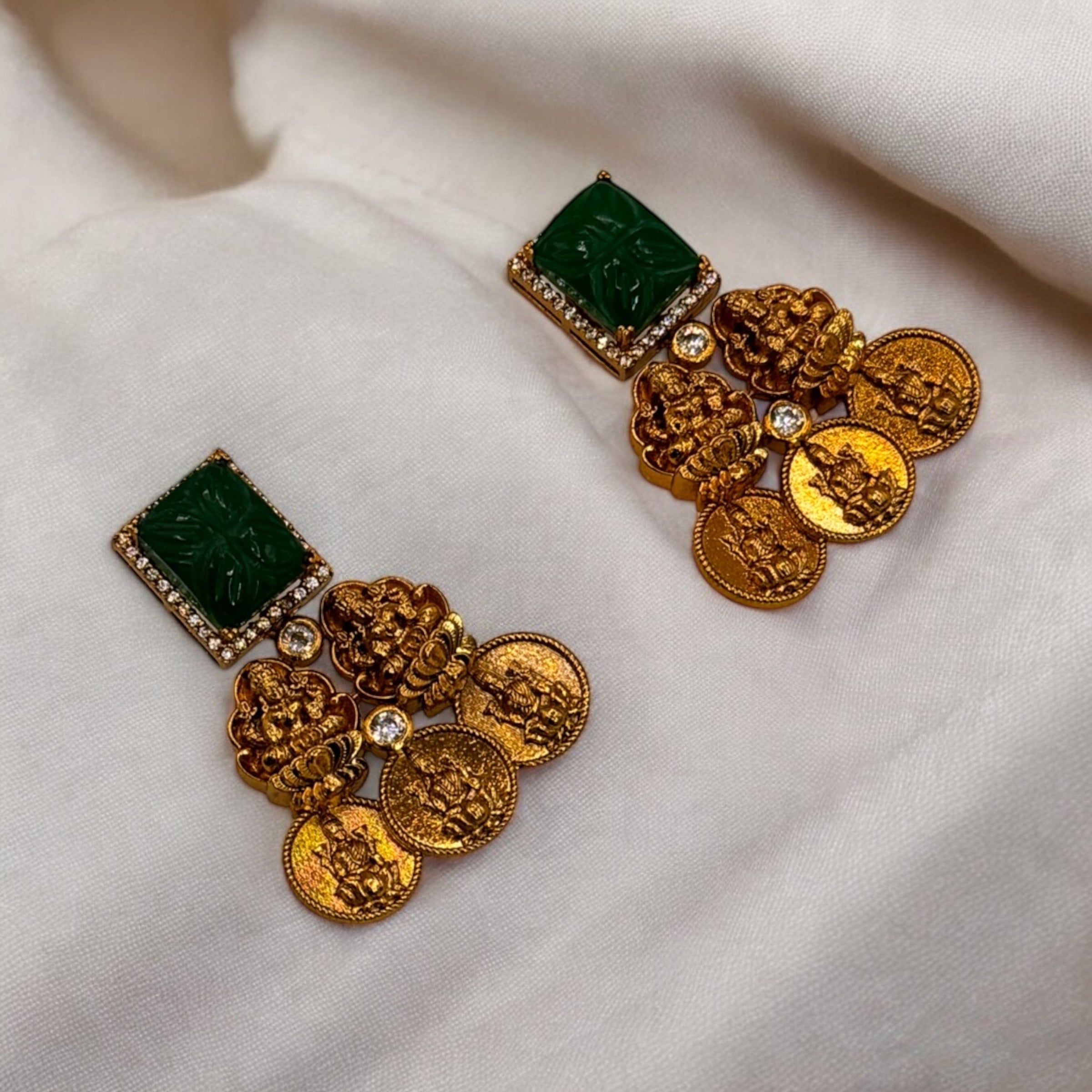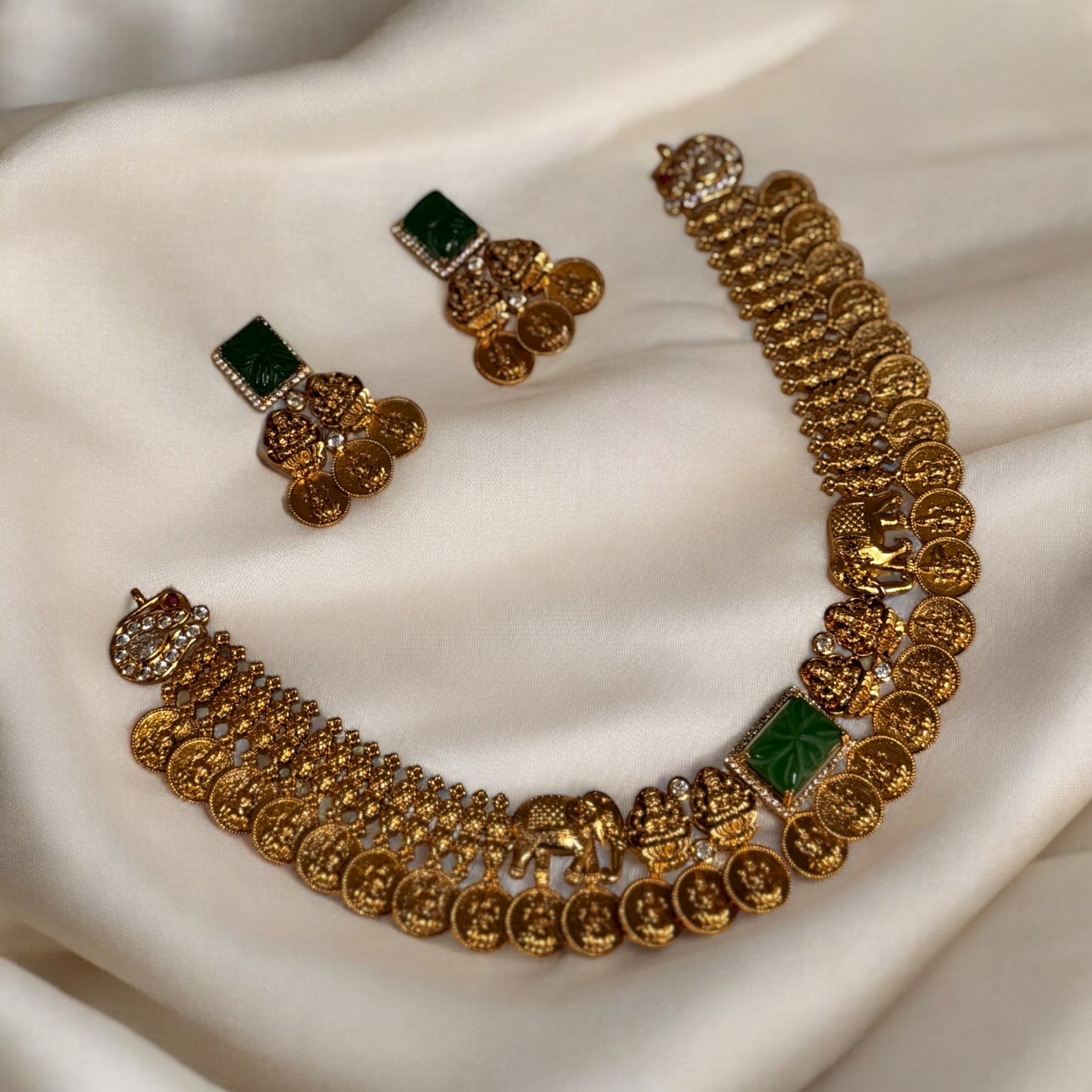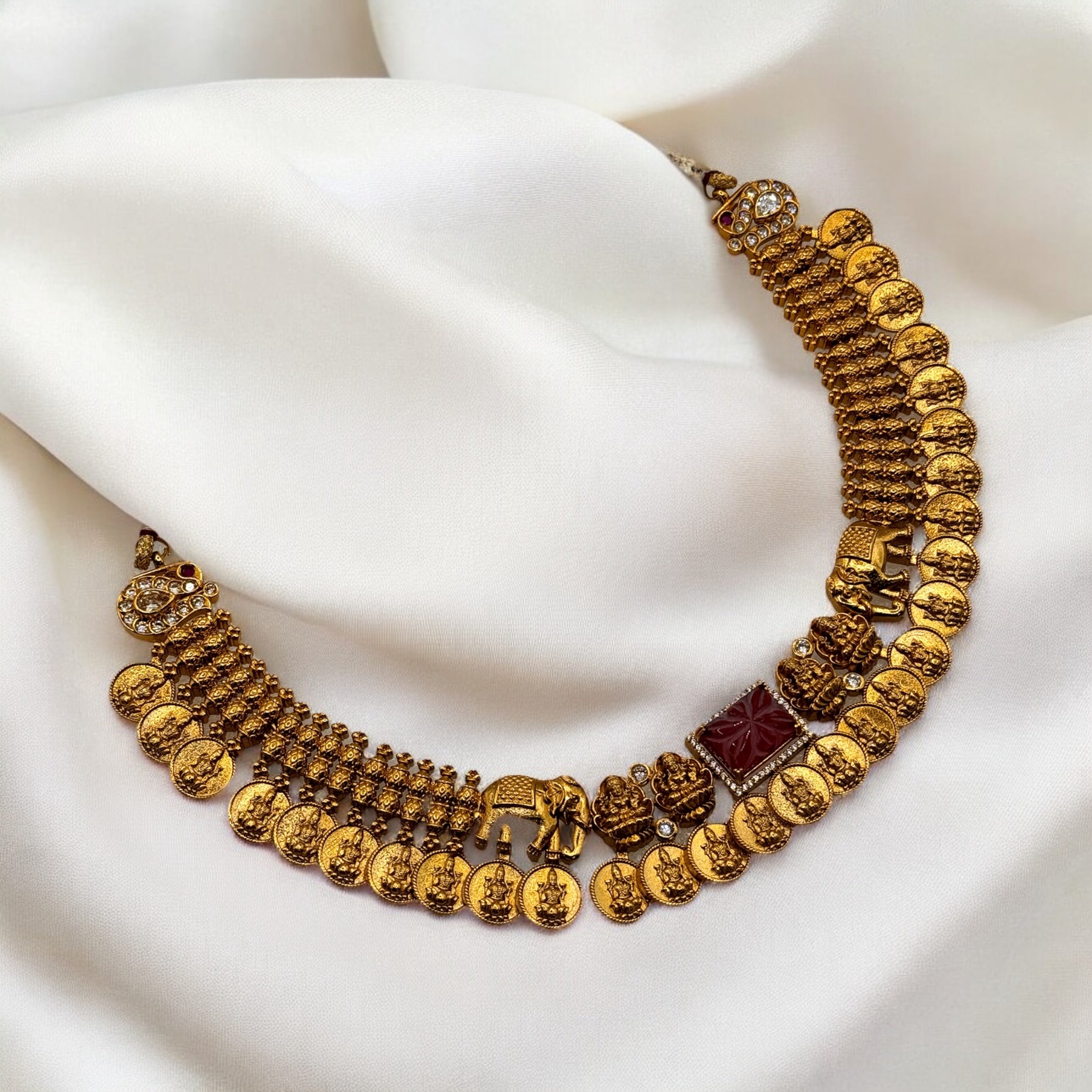 A traditional gold coin necklace (kasu mala) and matching earrings. The necklace features rows of intricately designed gold coins, interspersed with decorative motifs like elephants, temple carvings, and a central red stone accent. The design is further enhanced with ornamental detailing and fine craftsmanship, embodying cultural richness. The earrings complement the necklace, featuring a rectangular red stone at the top and small coin-like embellishments at the bottom, making the set ideal for festive or traditional occasions.