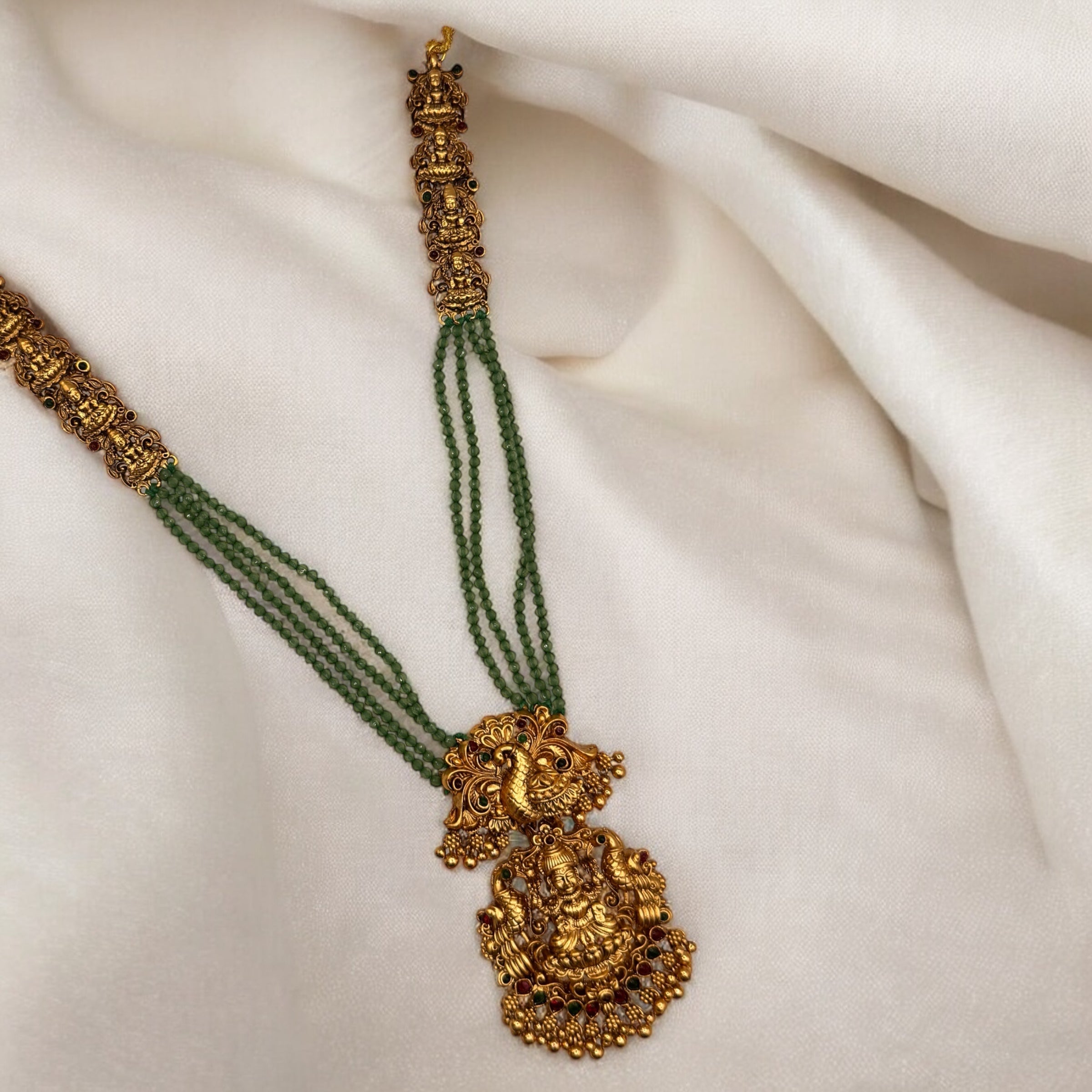 Add a touch of elegance to your look with our Gajalakshmi Beaded Haar. Handcrafted with intricate detail, this traditional Indian necklace features beautiful beads and a Gajalakshmi pendant. Perfect for special occasions or everyday wear. Available in various lengths for a comfortable fit.