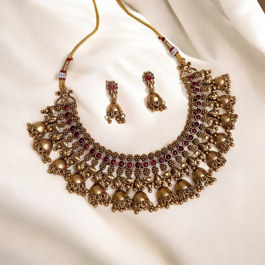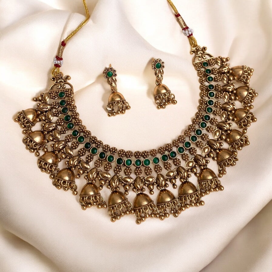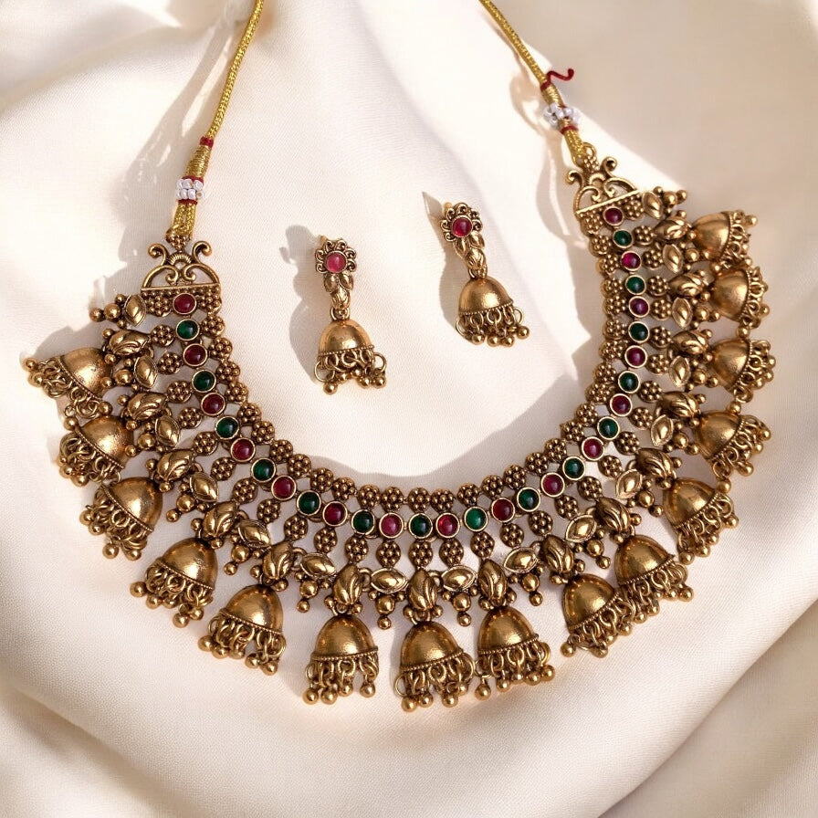 This elegant Ghungroo Necklace adds a touch of traditional charm to any outfit. Crafted with delicate ghungroo bells, this necklace brings a harmonious jingle with every movement. With its versatile design, it can be worn for cultural events or casual occasions, making it a must-have accessory.