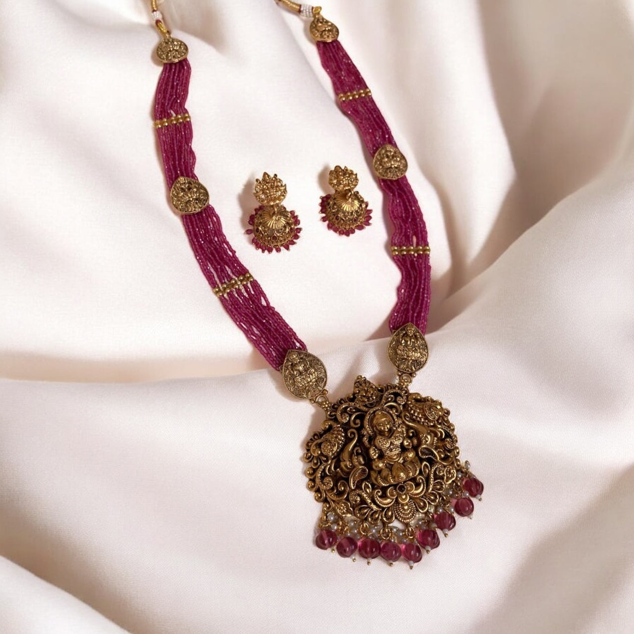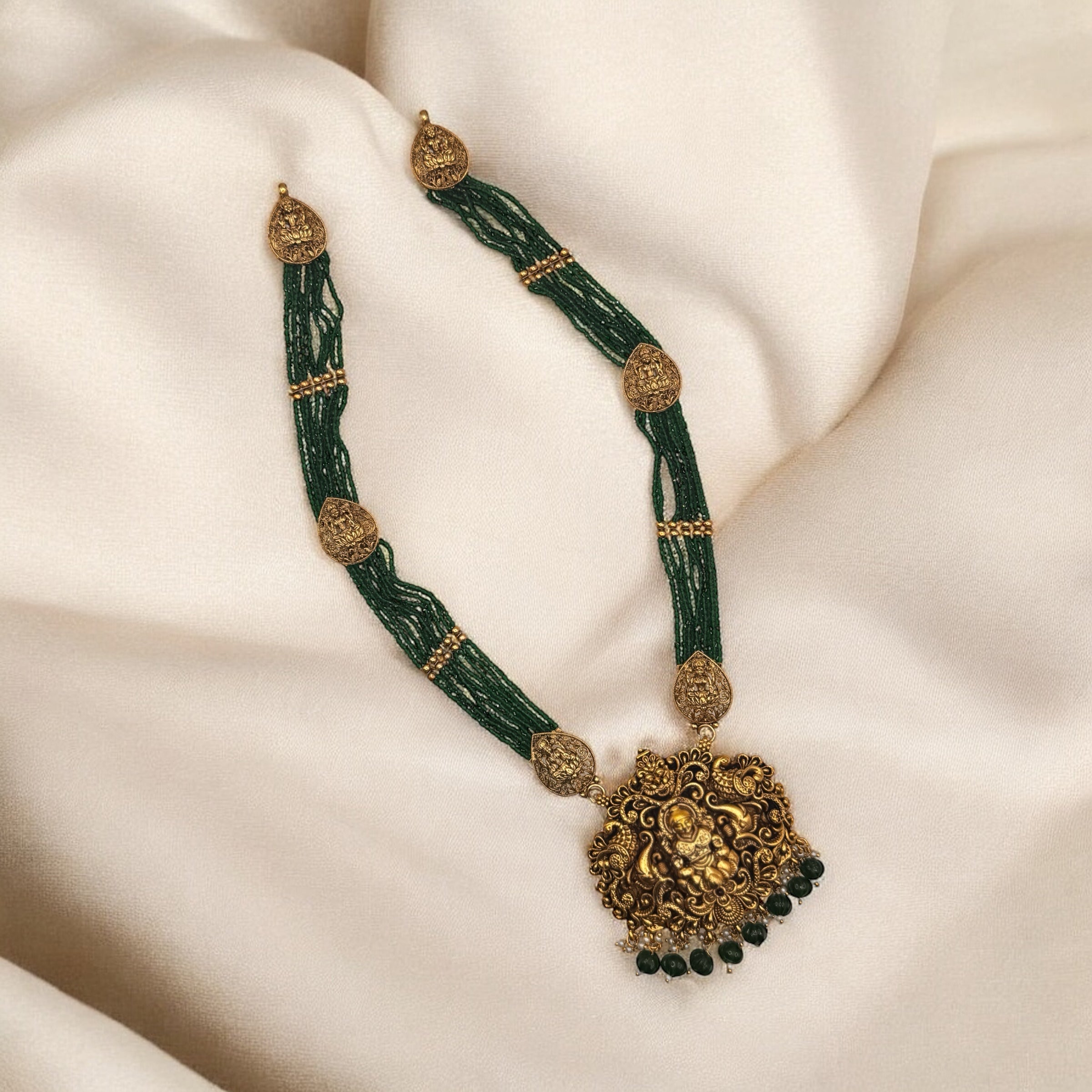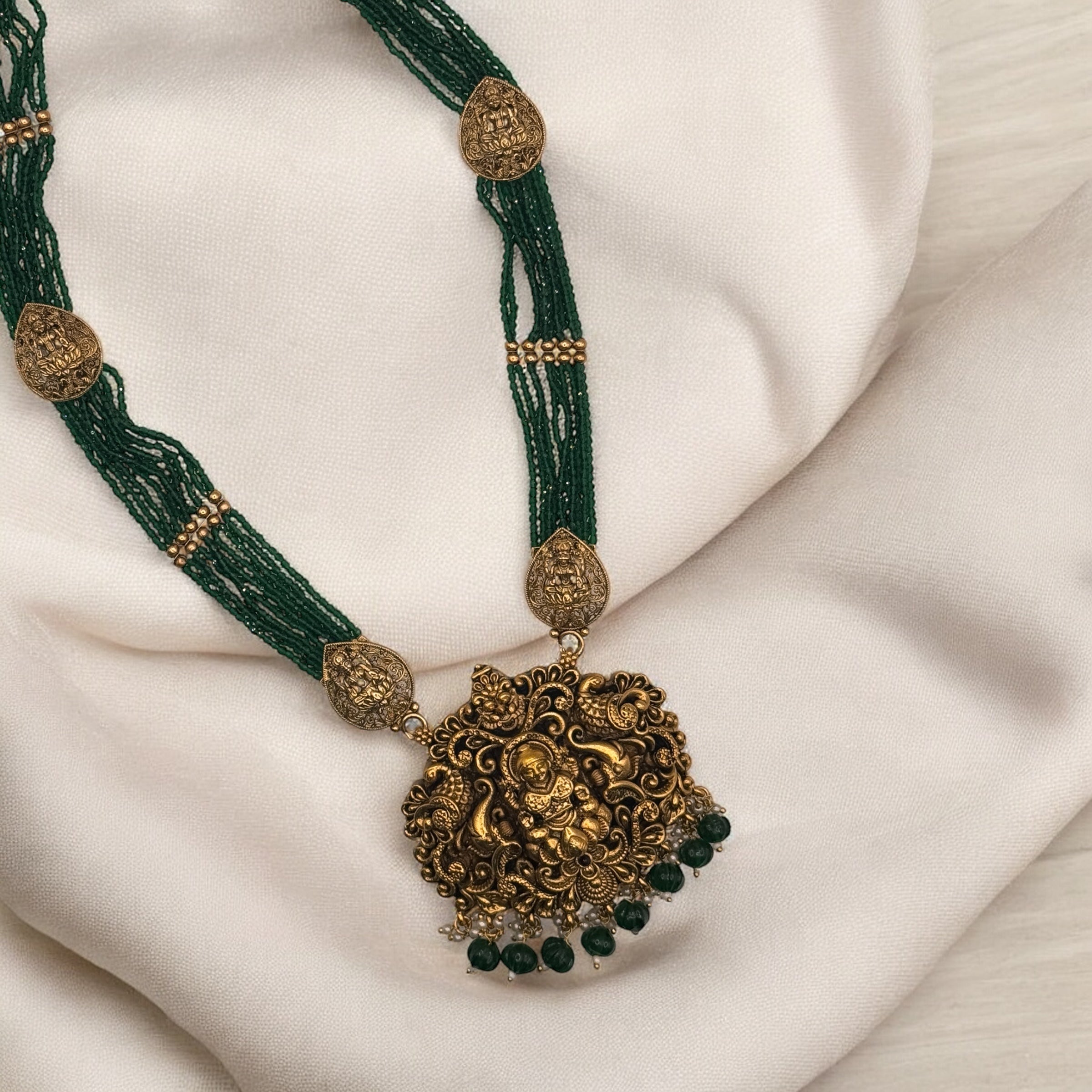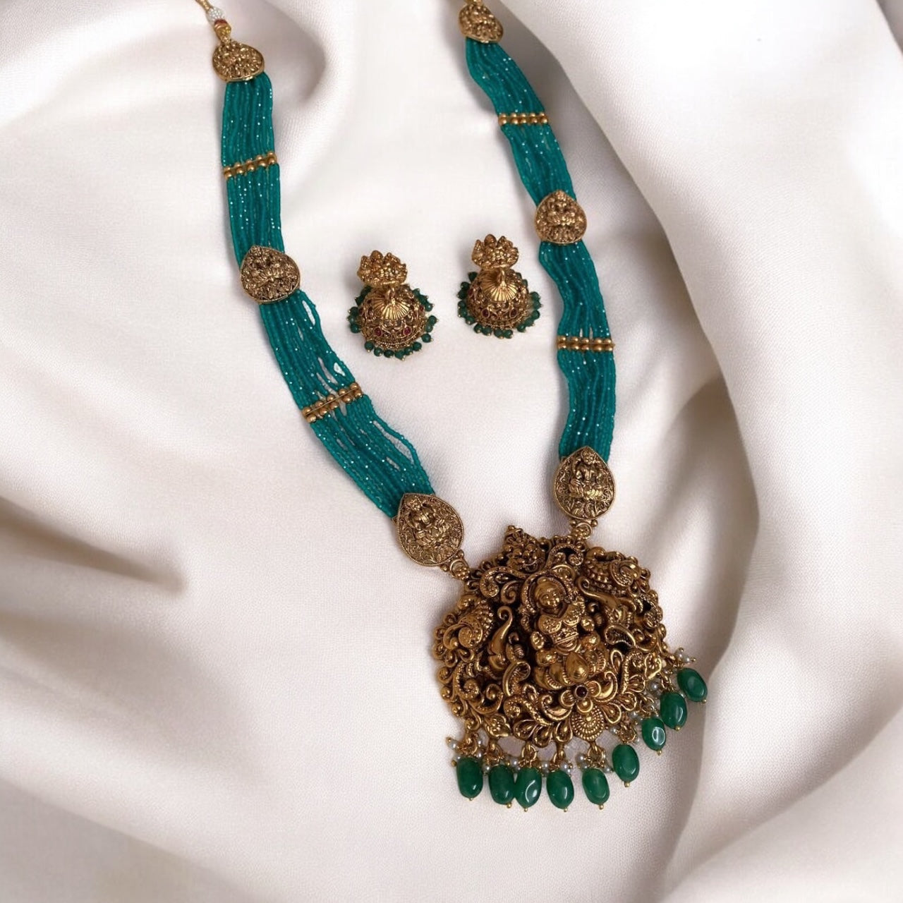 Meticulously crafted Goddess Haram necklace showcases intricate traditional design elements with superior craftsmanship. This statement piece features precise detailing that honors classical South Indian jewelry artistry while providing substantial presence for ceremonial occasions. The balanced proportions and authentic styling make it an heirloom-quality investment for your fine jewelry collection.