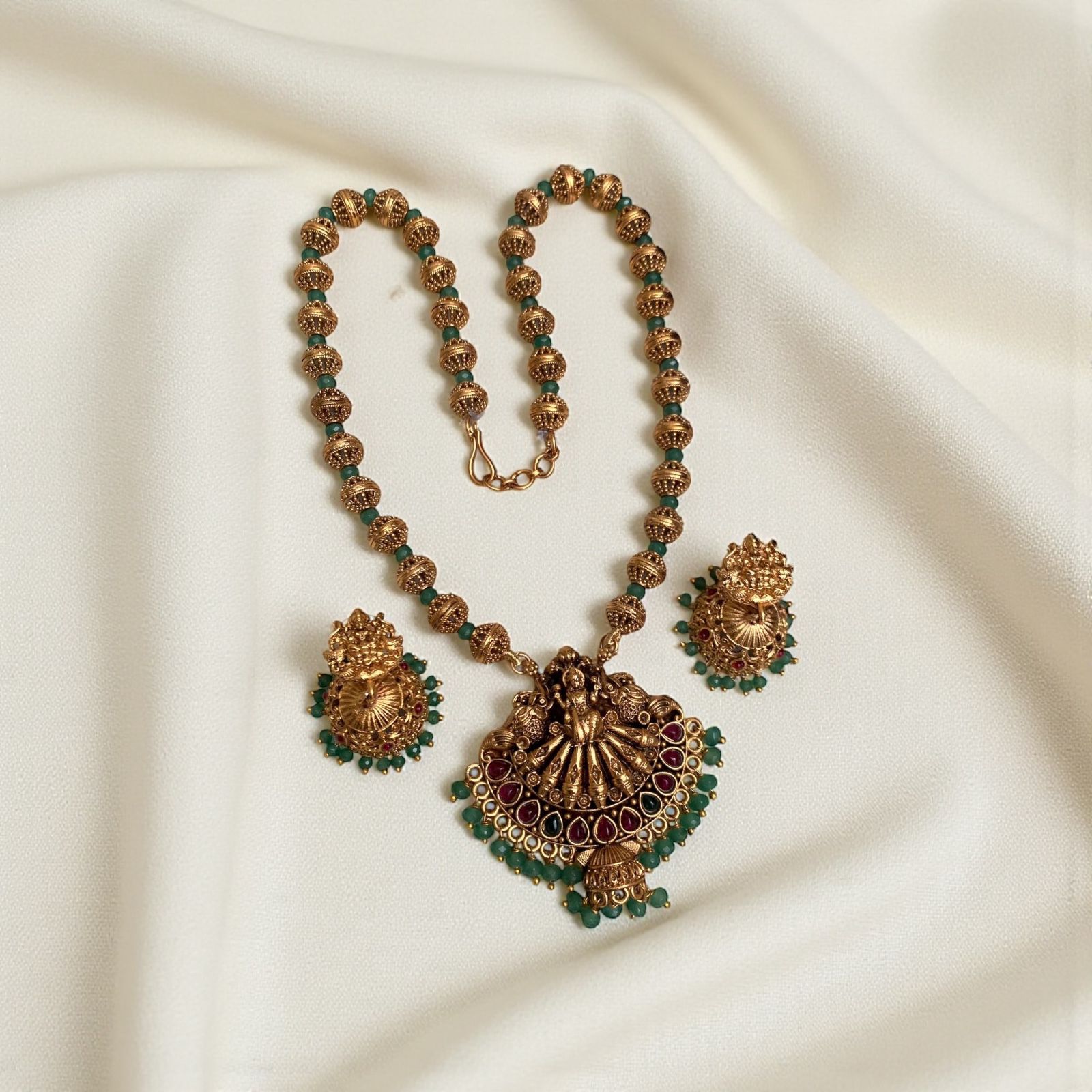 # Kavya Devi Haram Inspired by classical temple jewelry traditions, the Kavya Devi Haram showcases intricate craftsmanship with its elegant design. This traditional necklace features detailed metalwork that captures the essence of devotional elegance, making it an ideal choice for religious ceremonies, festivals, and special occasions. The piece combines authentic artistry with timeless appeal, allowing you to honor cultural heritage while making a refined statement. Perfect for those who appreciate the sophistication of traditional Indian jewelry.