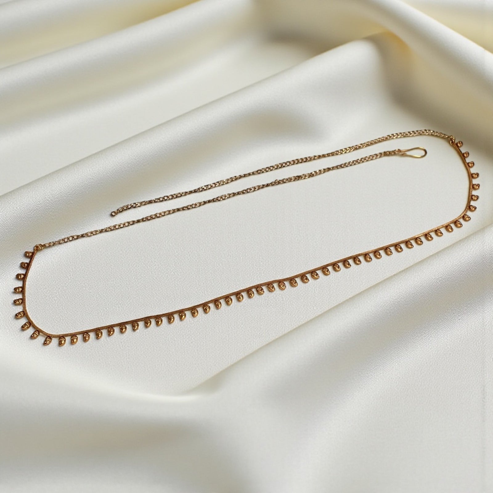Kemp Kamarpatta Slim is a refined waist ornament that combines traditional craftsmanship with contemporary elegance. Featuring kemp stones—a semi-precious gemstone prized in South Indian jewelry—this slim-profile kamarpatta drapes gracefully along the waist. The lightweight design ensures comfortable all-day wear, while the intricate detailing showcases expert artisanal work. Perfect for enhancing ethnic ensembles, this piece brings timeless sophistication to festive occasions and celebrations. An essential addition to any traditional jewelry collection.