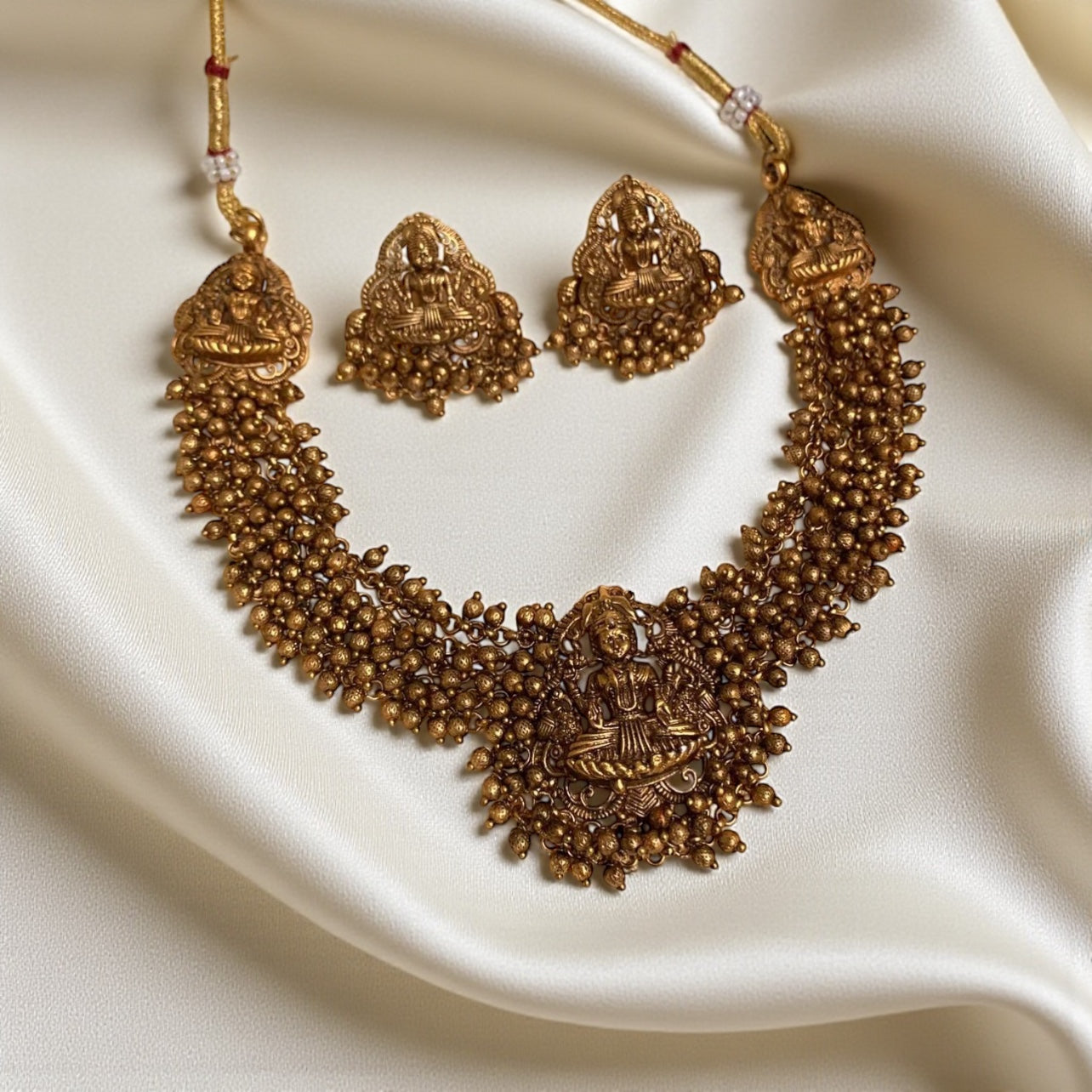The Lakshmi Aaradhya Necklace is a divine piece inspired by the goddess of wealth and prosperity. Crafted with meticulous attention to detail, this necklace features traditional motifs that celebrate spiritual elegance. The design combines sacred symbolism with refined craftsmanship, making it an ideal choice for religious occasions, festivals, or those seeking to honor their devotional practice. Each element is thoughtfully executed to ensure both aesthetic beauty and meaningful significance. Perfect for layering or wearing as a statement piece, this necklace brings timeless grace to any collection.