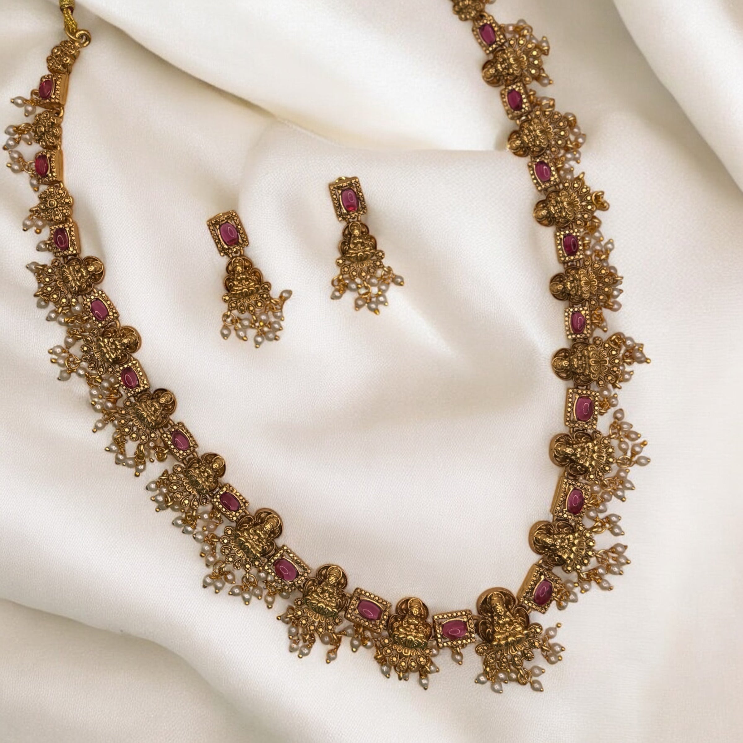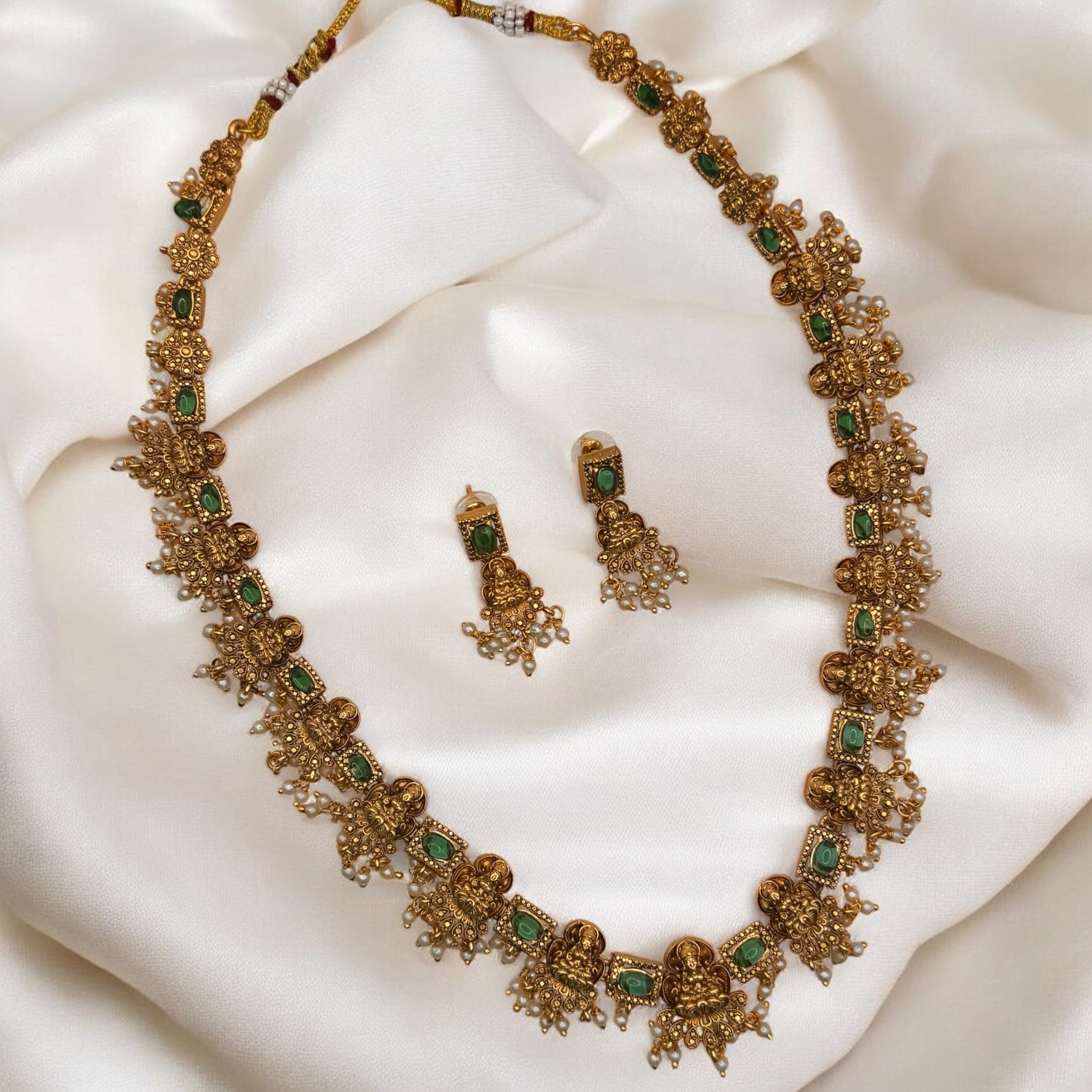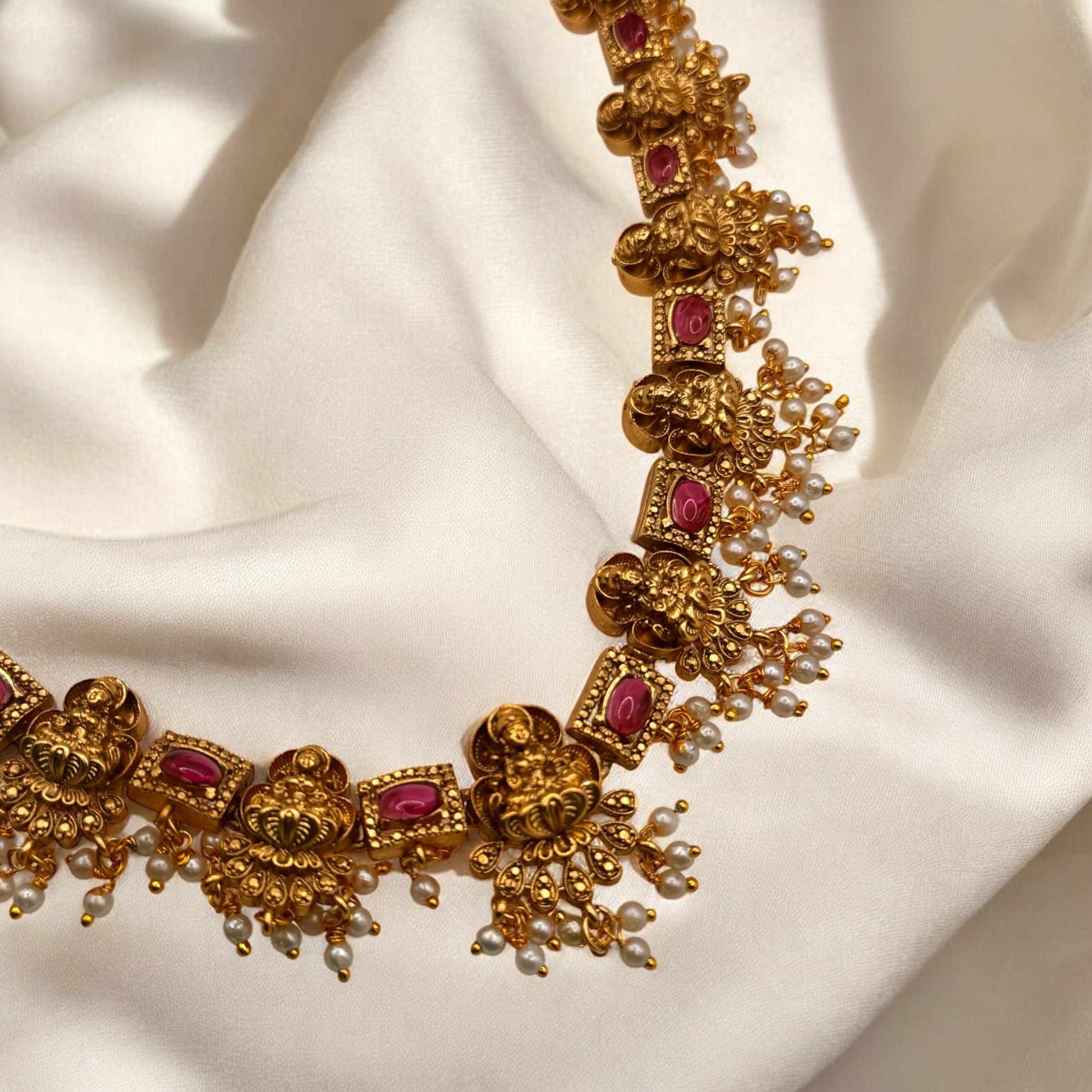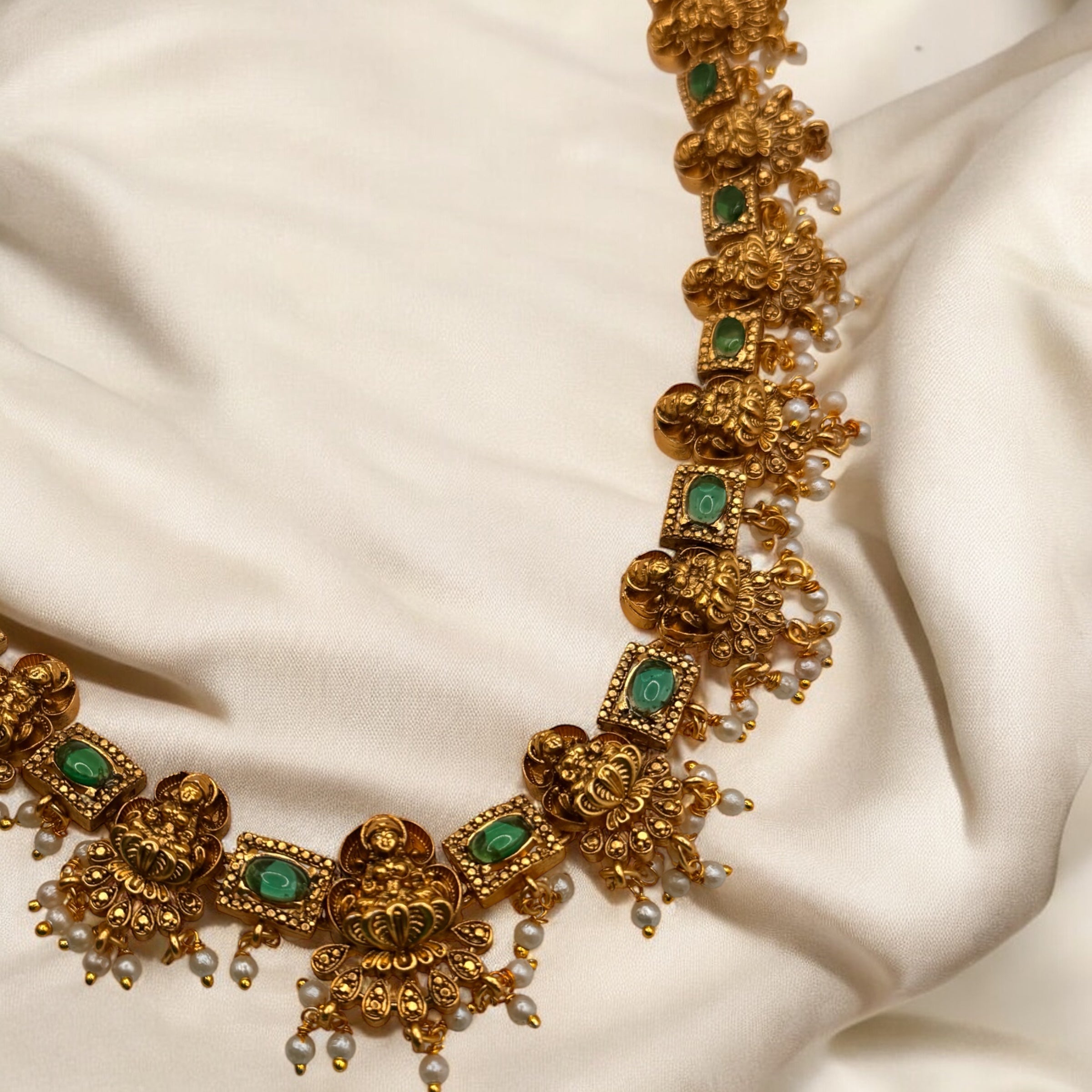 Elegantly crafted Lakshmi Stud Haar featuring intricate deity motifs that symbolize prosperity and abundance. This traditional necklace combines cultural significance with superior craftsmanship, making it an ideal choice for religious ceremonies and festive occasions. The detailed studs enhance the necklace's ornate appearance while maintaining a balanced weight distribution for comfortable wear.
