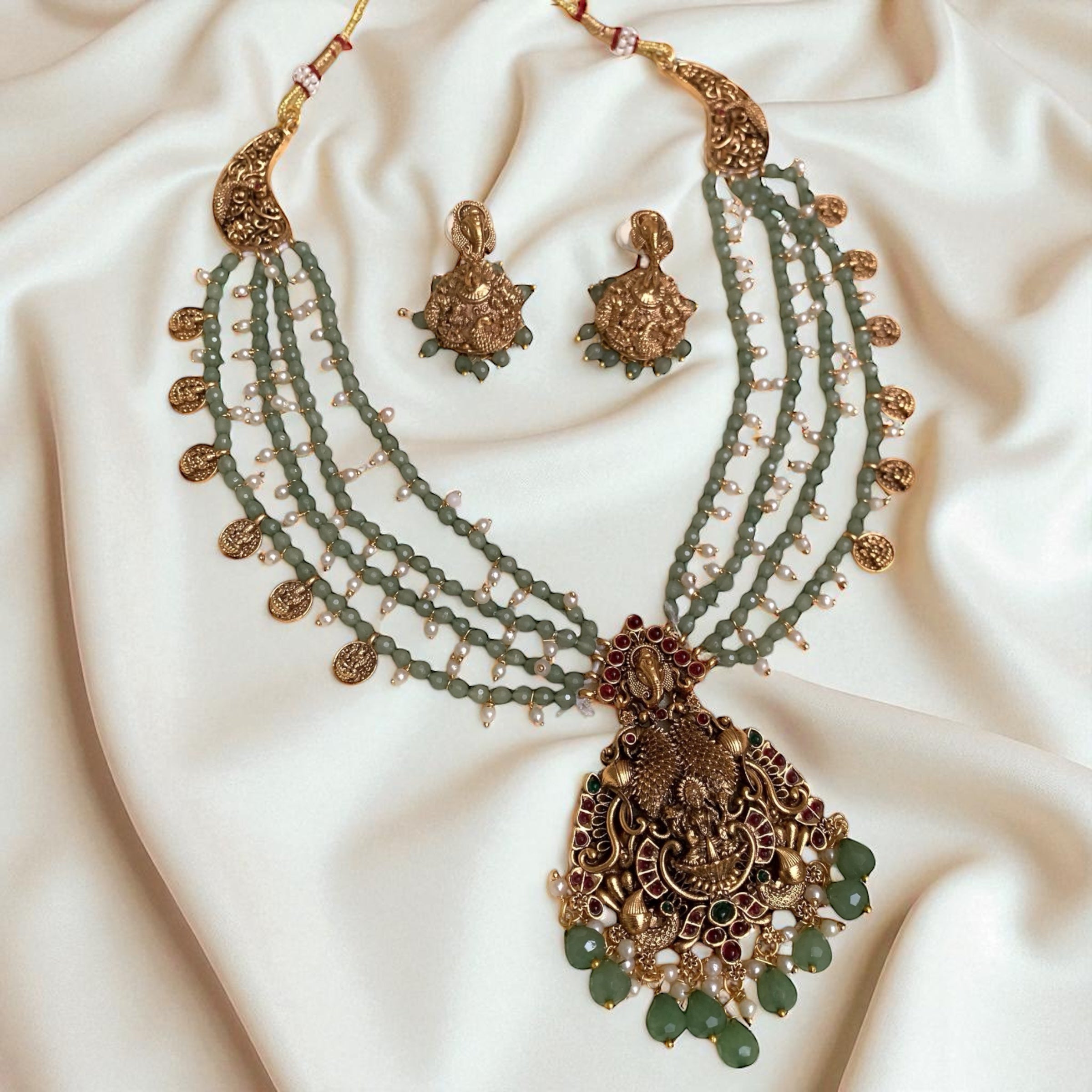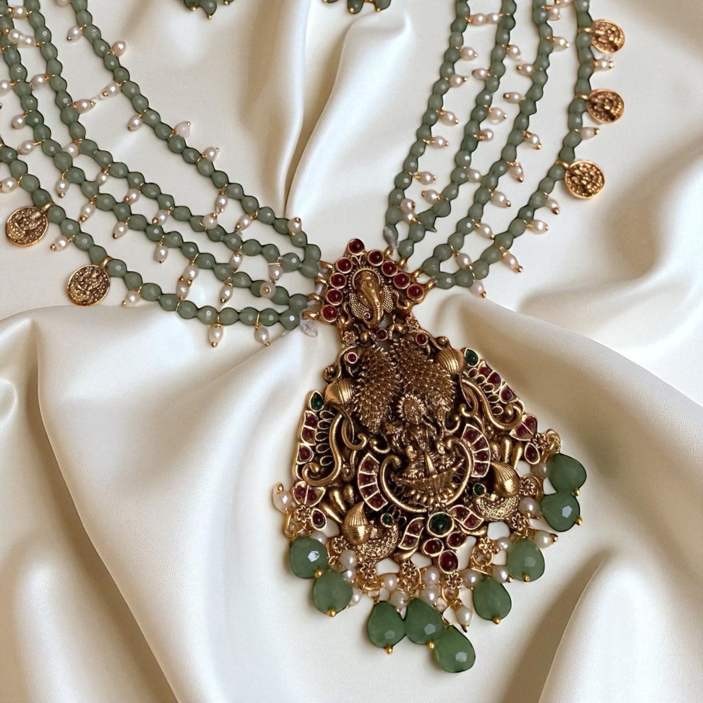 The Layered Lakshmi Necklace combines traditional elegance with expert craftsmanship. Featuring multiple delicate chains adorned with intricately detailed Lakshmi motifs, this necklace enhances any attire with a rich cultural touch. Its layered design adds dimension and grace, making it a versatile piece for both festive occasions and refined everyday wear. Crafted to ensure lasting beauty, it symbolizes prosperity and divine blessing while elevating your jewelry collection with sophistication.