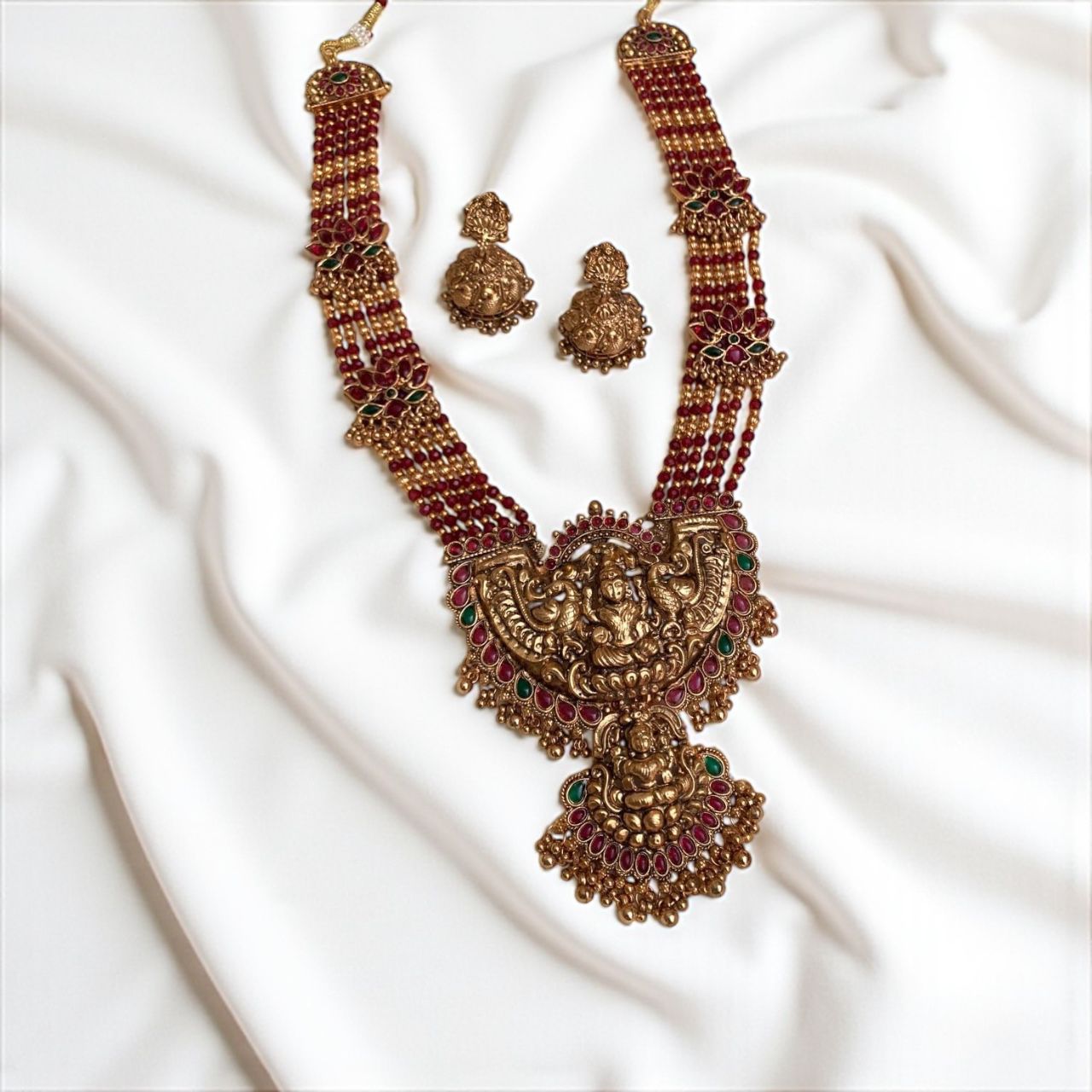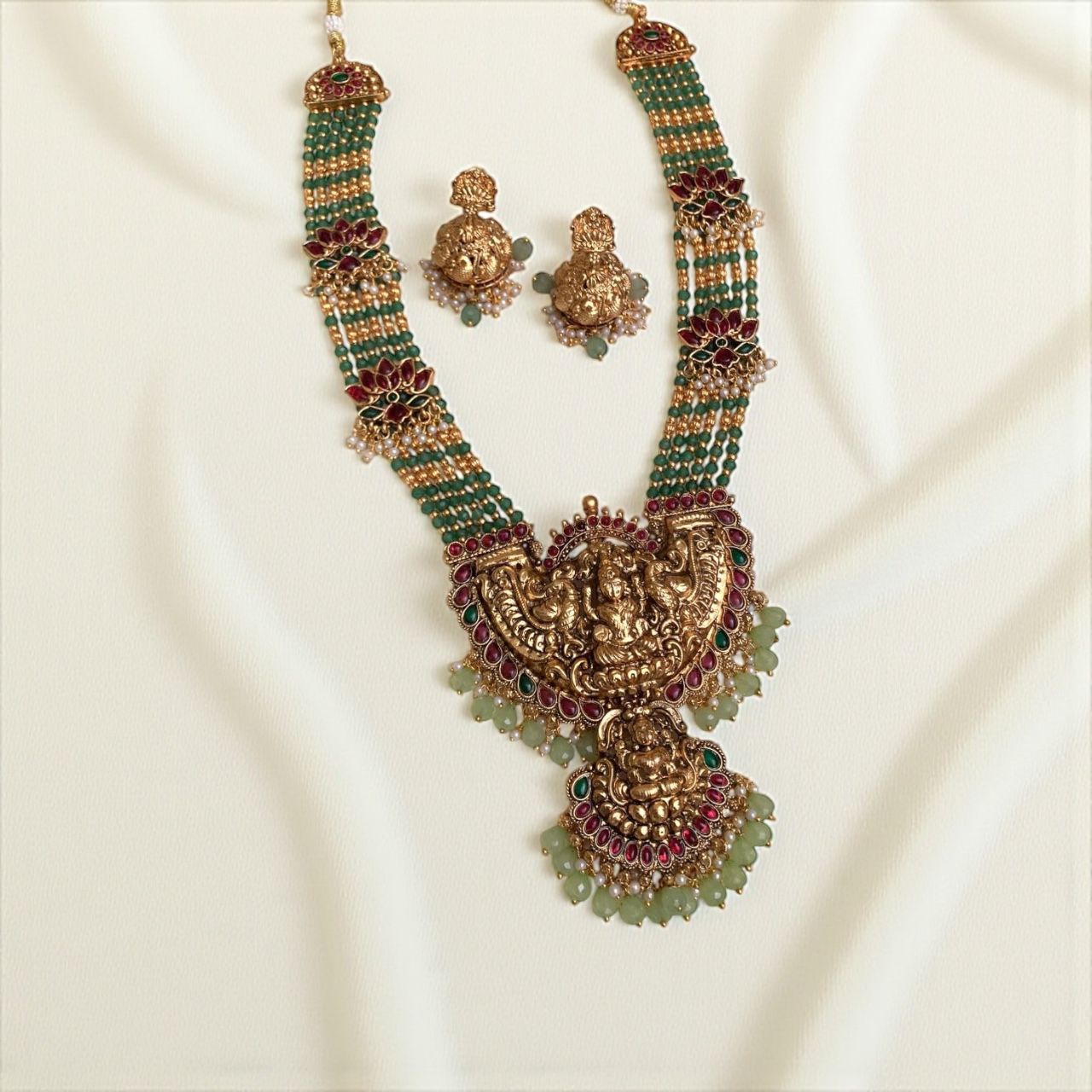 The Lotus Lakshmika Haram is an intricately designed necklace symbolizing prosperity and elegance. Featuring traditional motifs inspired by Lakshmi, the goddess of wealth, this haram blends cultural significance with refined craftsmanship. Ideal for special occasions, it elevates any attire with its timeless charm and detailed artistry.