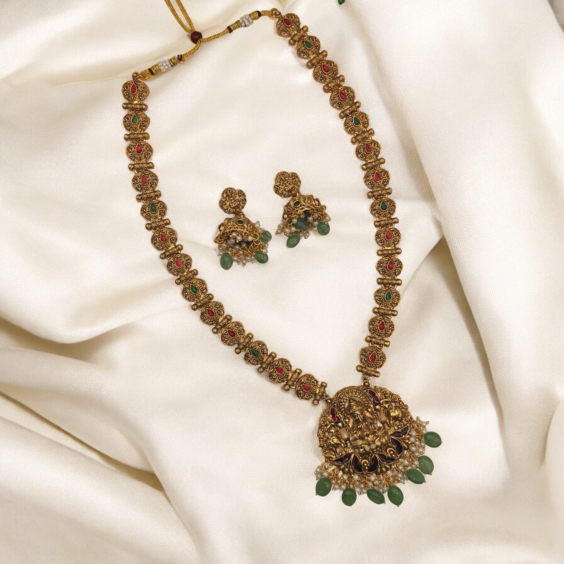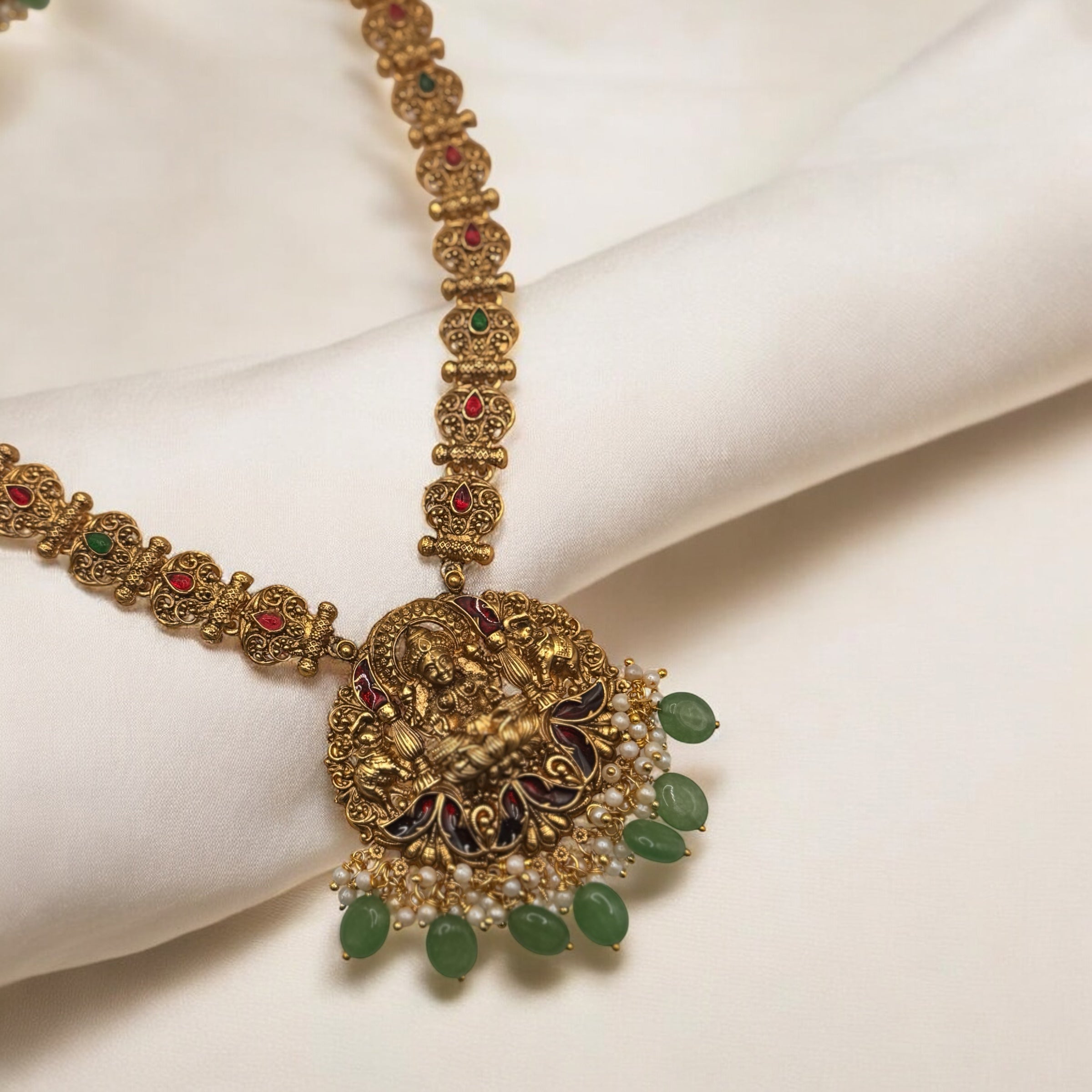 The Manilaxmi Haram is a finely crafted traditional necklace that embodies timeless elegance. Designed with intricate detailing, it enhances any ethnic ensemble with its classic charm. Perfect for special occasions, this haram offers both sophistication and cultural richness, making it a valuable addition to your jewelry collection.