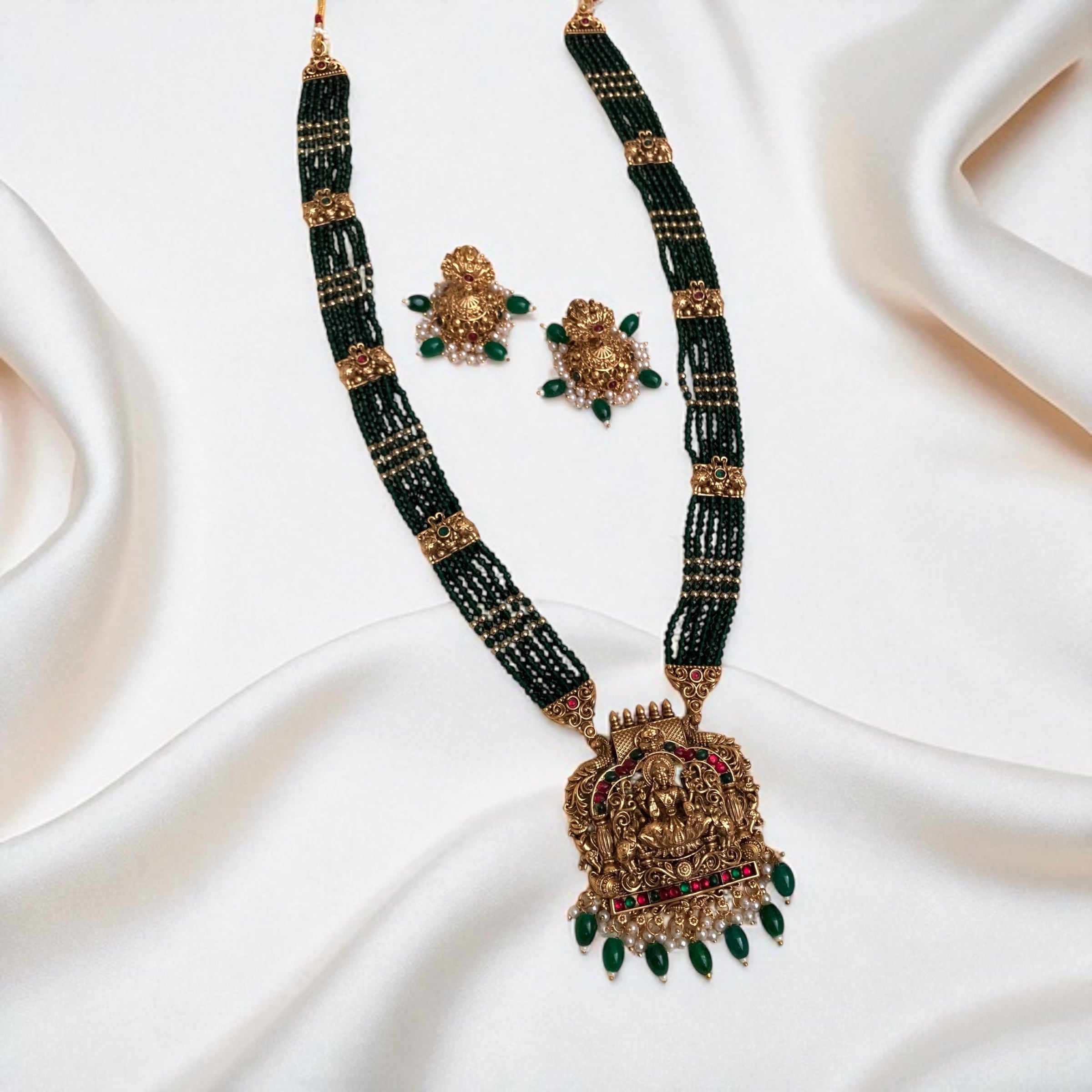 The Meenakshi Haram is a traditional South Indian necklace inspired by the intricate temple jewelry designs associated with Goddess Meenakshi. Crafted with meticulous detail, this haram features elaborate motifs and a rich, antique finish that enhances its cultural significance. Ideal for special occasions and classical events, it adds a regal touch to any attire while reflecting expert craftsmanship and heritage artistry.