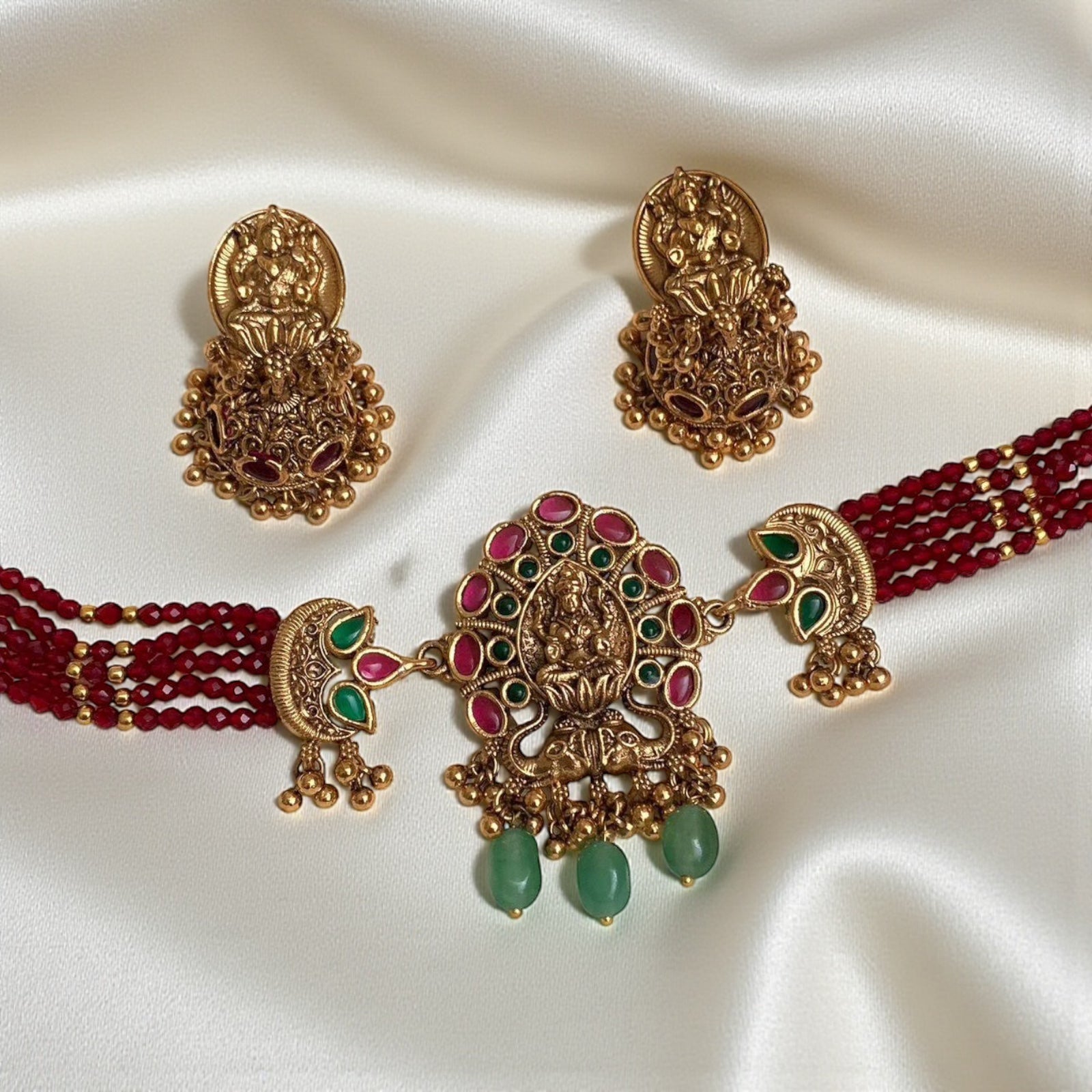 The Rajeshwari Choker Set exemplifies traditional craftsmanship with contemporary elegance. This meticulously designed ensemble features a statement choker paired with complementary pieces, showcasing intricate detailing characteristic of fine jewelry artistry. The set combines classic design principles with refined aesthetics, making it an ideal choice for special occasions, festive celebrations, or those seeking to elevate their everyday jewelry collection. Each piece is crafted to deliver both visual impact and wearable sophistication, ensuring lasting appeal and versatility across various styling preferences.
