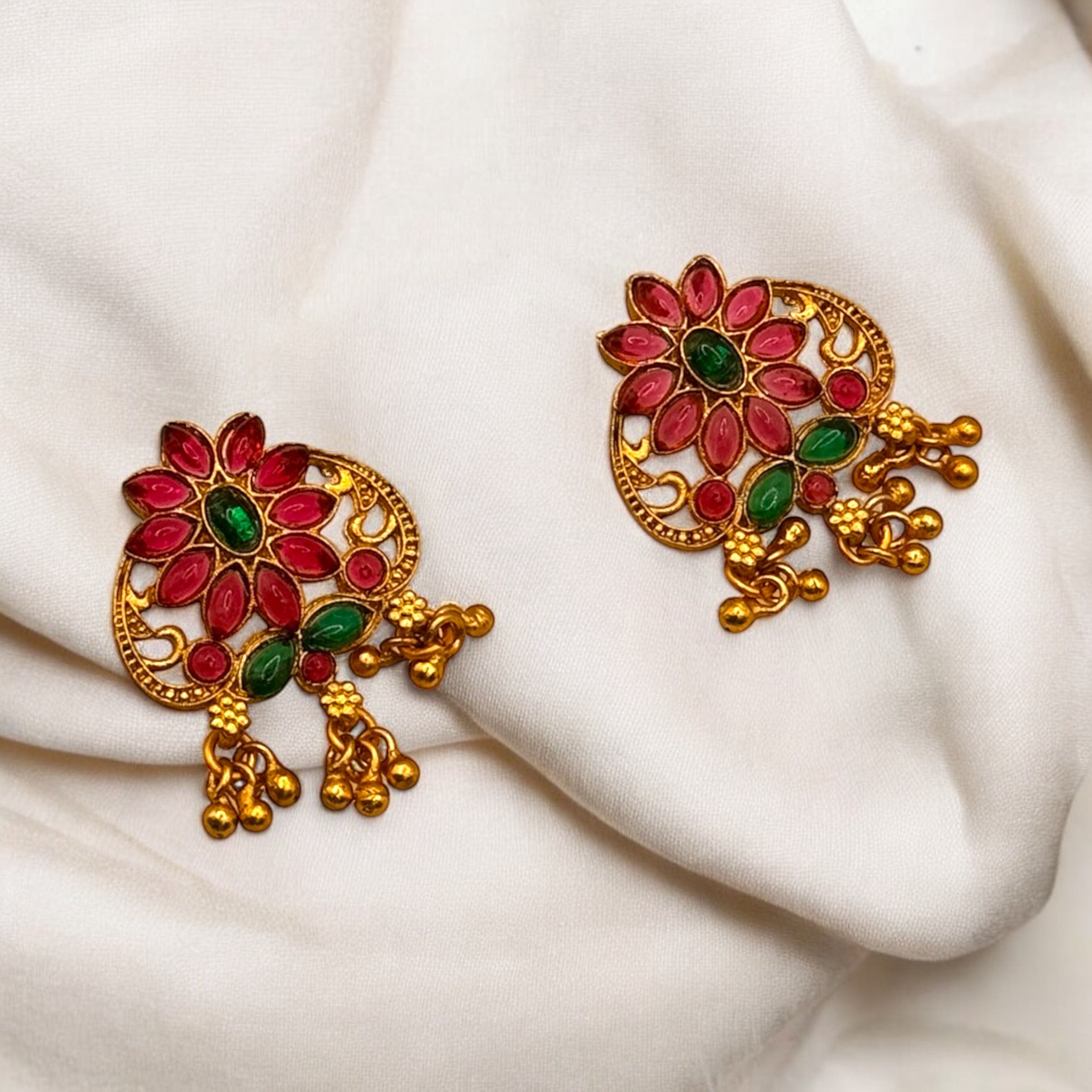 This is a set of traditional Indian jewelry featuring a waist belt (vaddanam) and earrings. The design showcases intricate craftsmanship with floral and elephant motifs. The piece is richly adorned with red and green stones, likely imitating rubies and emeralds, and finished with gold-tone metal. The hanging bead-like elements enhance its elegance and add a classic touch, suitable for ethnic or bridal wear.