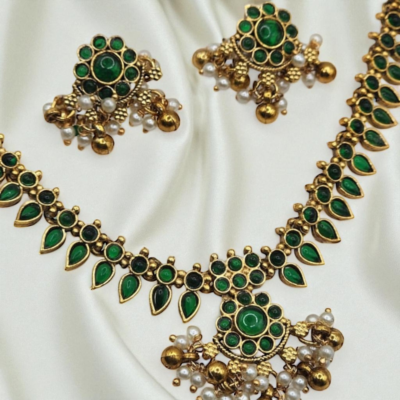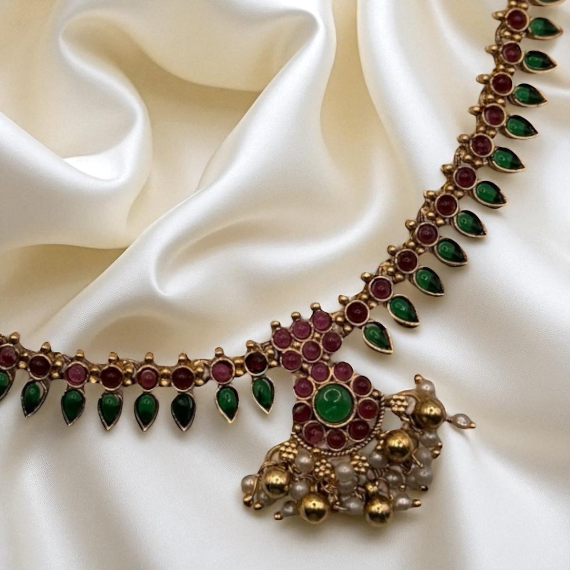 This exquisite necklace features a stunning combination of rubies and emeralds, delicately arranged to create a graceful and elegant design. The vibrant colors and expert craftsmanship make it the perfect accessory for any occasion. Elevate your style and add a touch of sophistication to your wardrobe with the Ruby Emerald Grace Necklace.