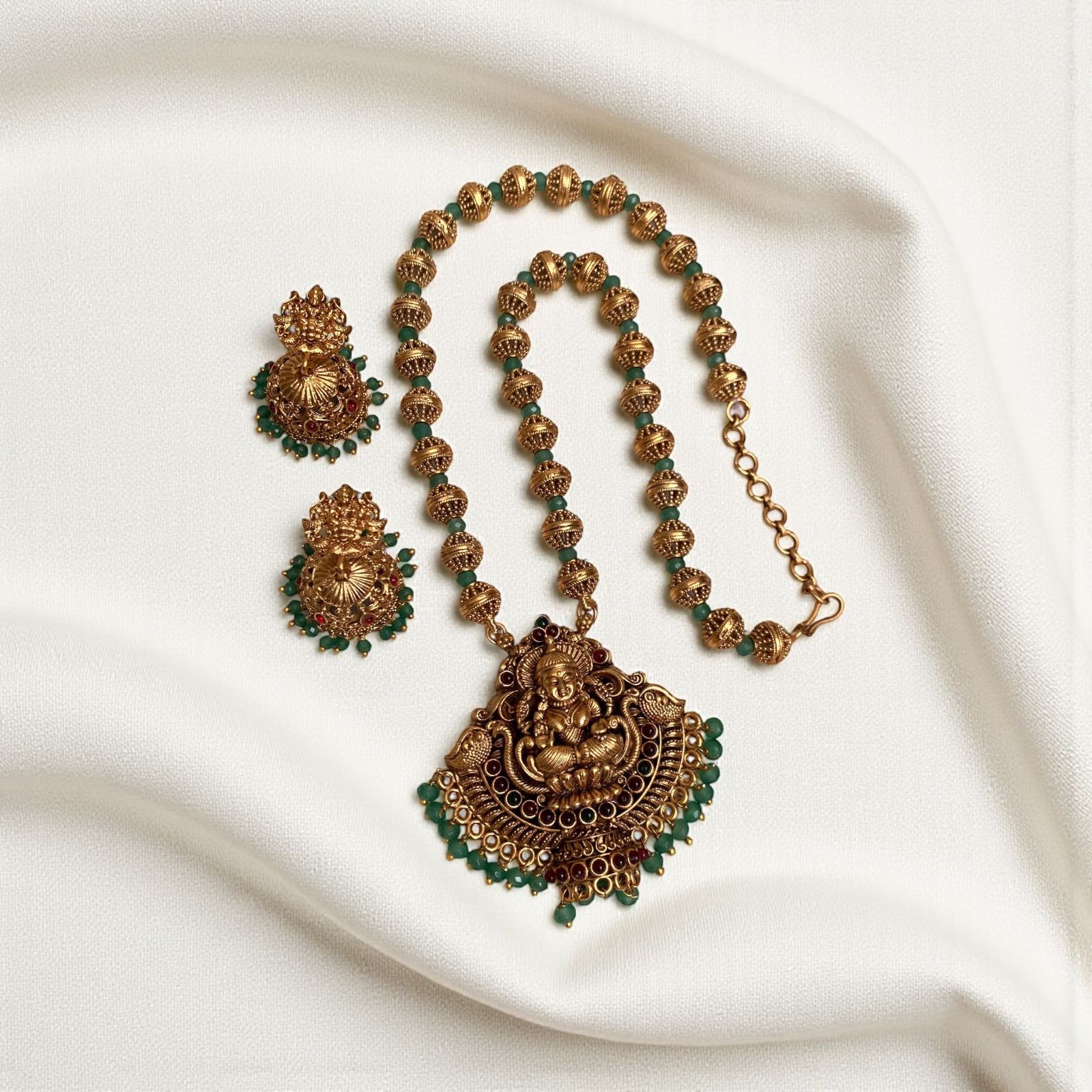 Swarna Devi Haram is a traditional long necklace that embodies timeless elegance and cultural significance. Crafted with meticulous attention to detail, this piece features intricate design work characteristic of classic Indian jewelry. The haram's extended length makes it versatile for layering or wearing as a statement piece, complementing both traditional attire and contemporary styling. Perfect for special occasions, festivals, or adding sophistication to everyday wear, this necklace represents the finest in heritage craftsmanship and enduring beauty.